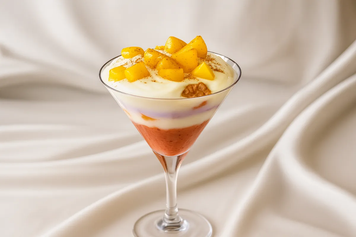 Layer pudding, yoghurt and peaches.
