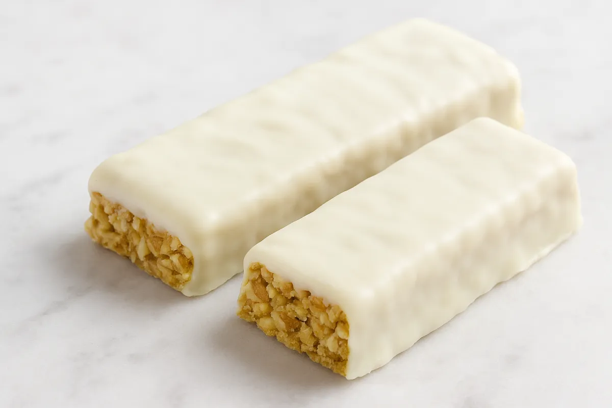 Line a baking sheet with baking paper. Working with one frozen bar at a time, dip the bottom of the bar into the yoghurt and allow any excess to drip off.